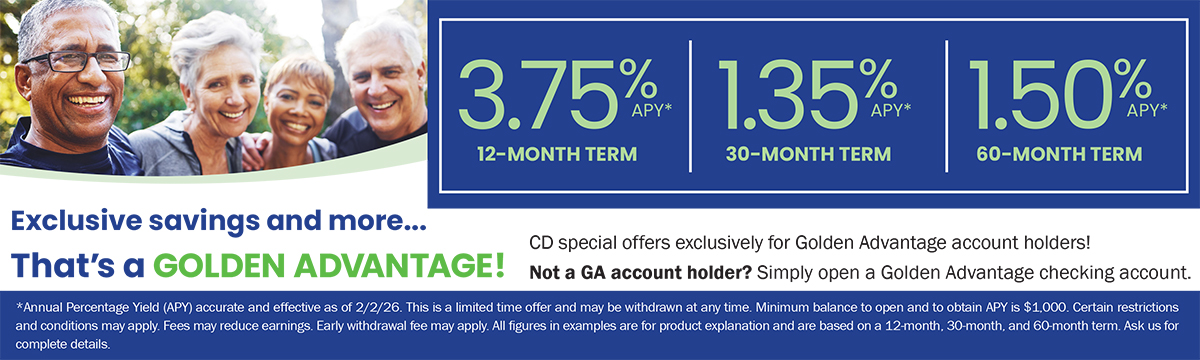 *Annual Percentage Yield (APY) accurate and effective as of 2/02/2026. This is a limited time offer and may be withdrawn at any time. Minimum balance to open and to obtain APY is $1,000.00. Certain restrictions and conditions may apply. Fees may reduce earnings. Early withdrawal fee may apply. All figures in examples are for product explanation and are based on a 5-month, 10-month term, 15-month term, and 23-month term. Ask us for complete details.