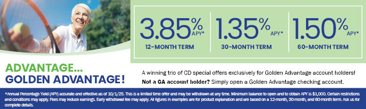 *Annual Percentage Yield (APY) accurate and effective as of 10/01/2025. This is a limited time offer and may be withdrawn at any time. Minimum balance to open and to obtain APY is $1,000.00. Certain restrictions and conditions may apply. Fees may reduce earnings. Early withdrawal fee may apply. All figures in examples are for product explanation and are based on a 5-month, 10-month term, 15-month term, and 23-month term. Ask us for complete details.